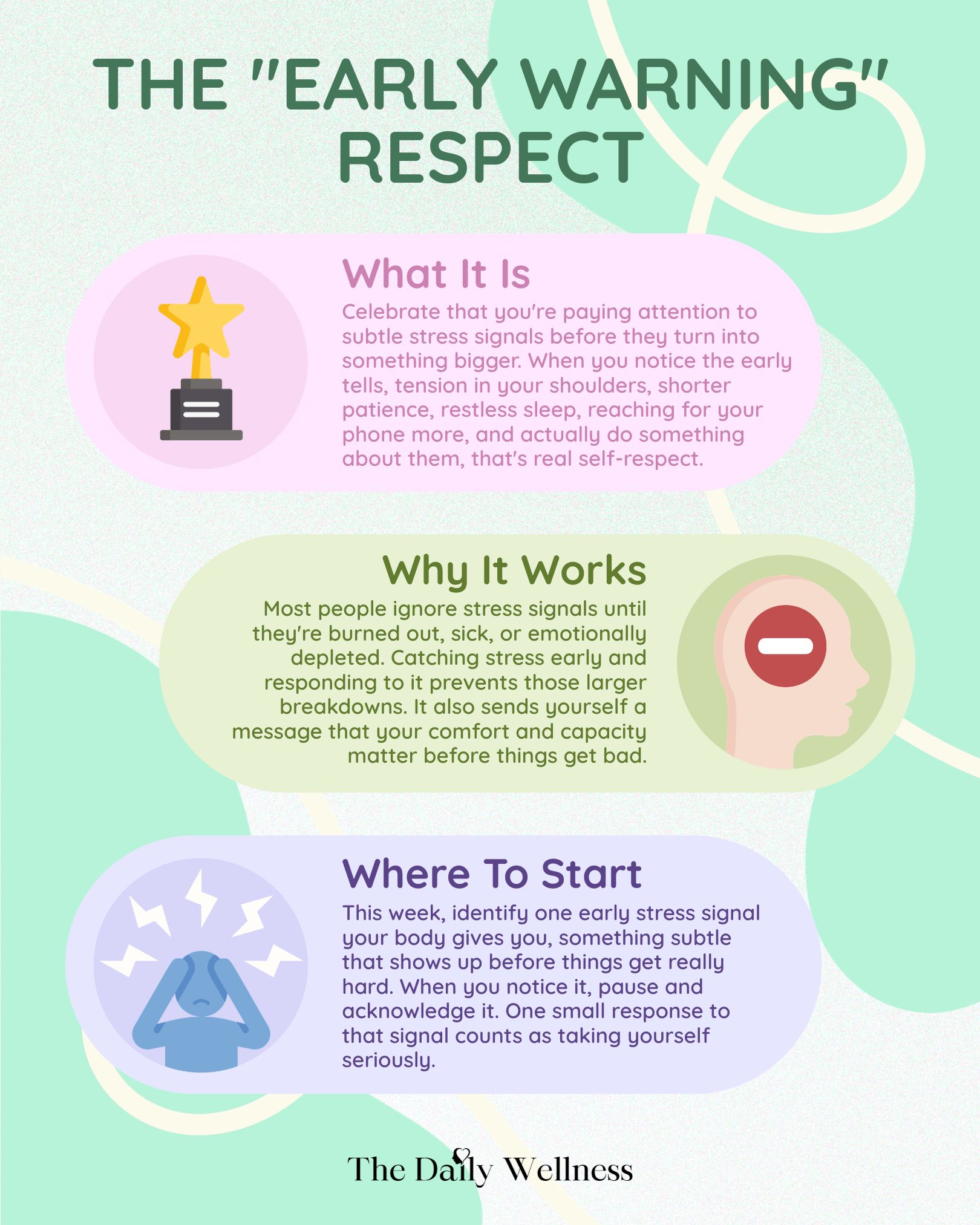 Why it works: Most people ignore stress signals until they're burned out, sick, or emotionally depleted. Catching stress early and responding to it prevents those larger breakdowns. It also sends yourself a message that your comfort and capacity matter before things get bad.