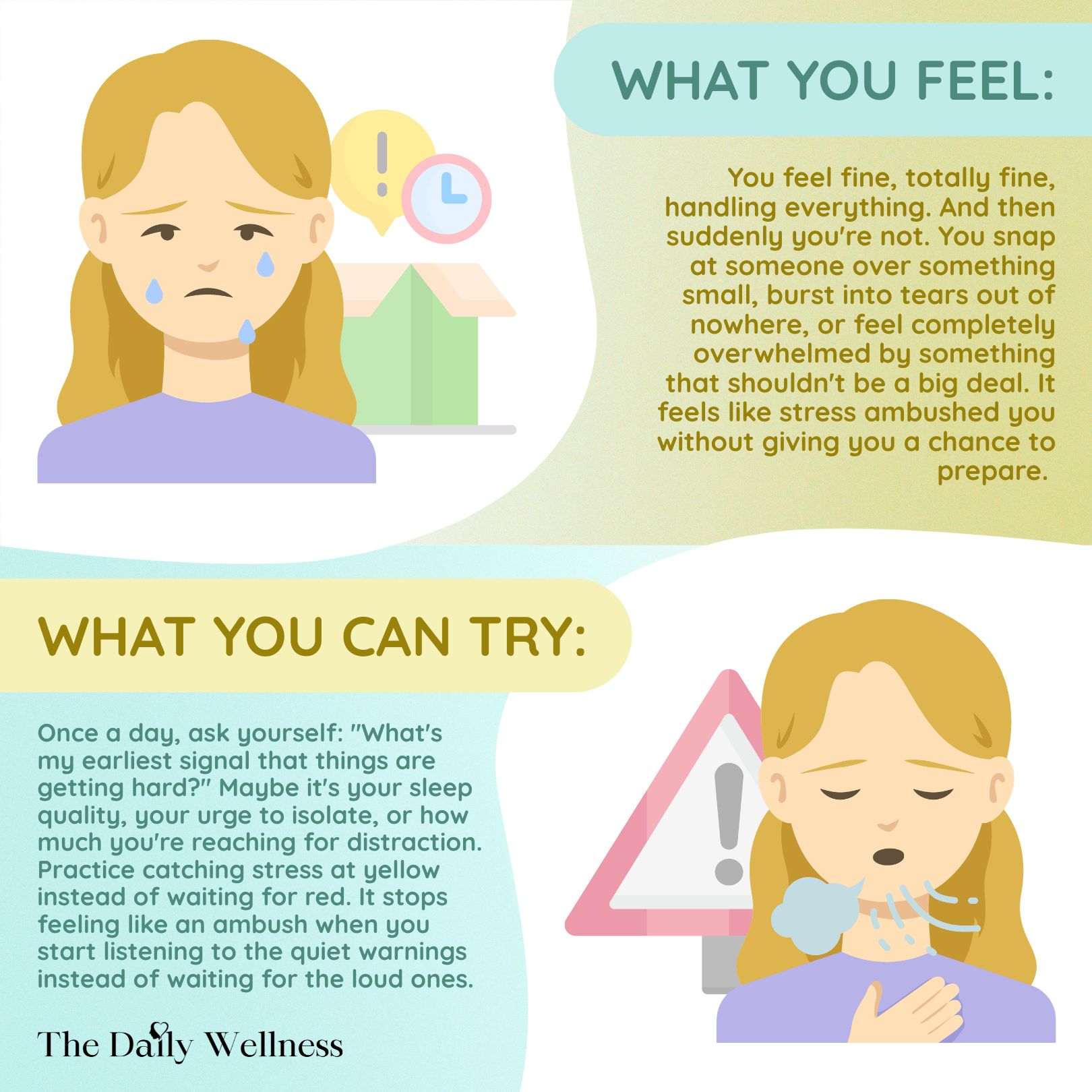 Practice catching stress at yellow instead of waiting for red. It stops feeling like an ambush when you start listening to the quiet warnings instead of waiting for the outburst.
