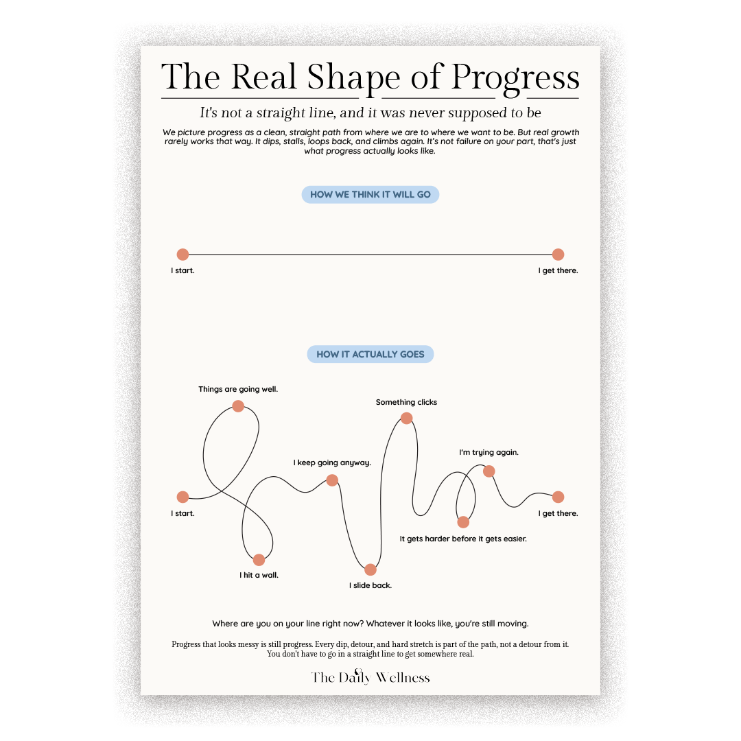 Progress is supposed to go in a straight line, that's what we picture, anyway. But real growth dips, stalls, loops back, and climbs again. This free The Real Shape of Progress poster maps out what that actually looks like, so the next time you feel like you're going backward, you can see it for what it is: a normal part of the path.