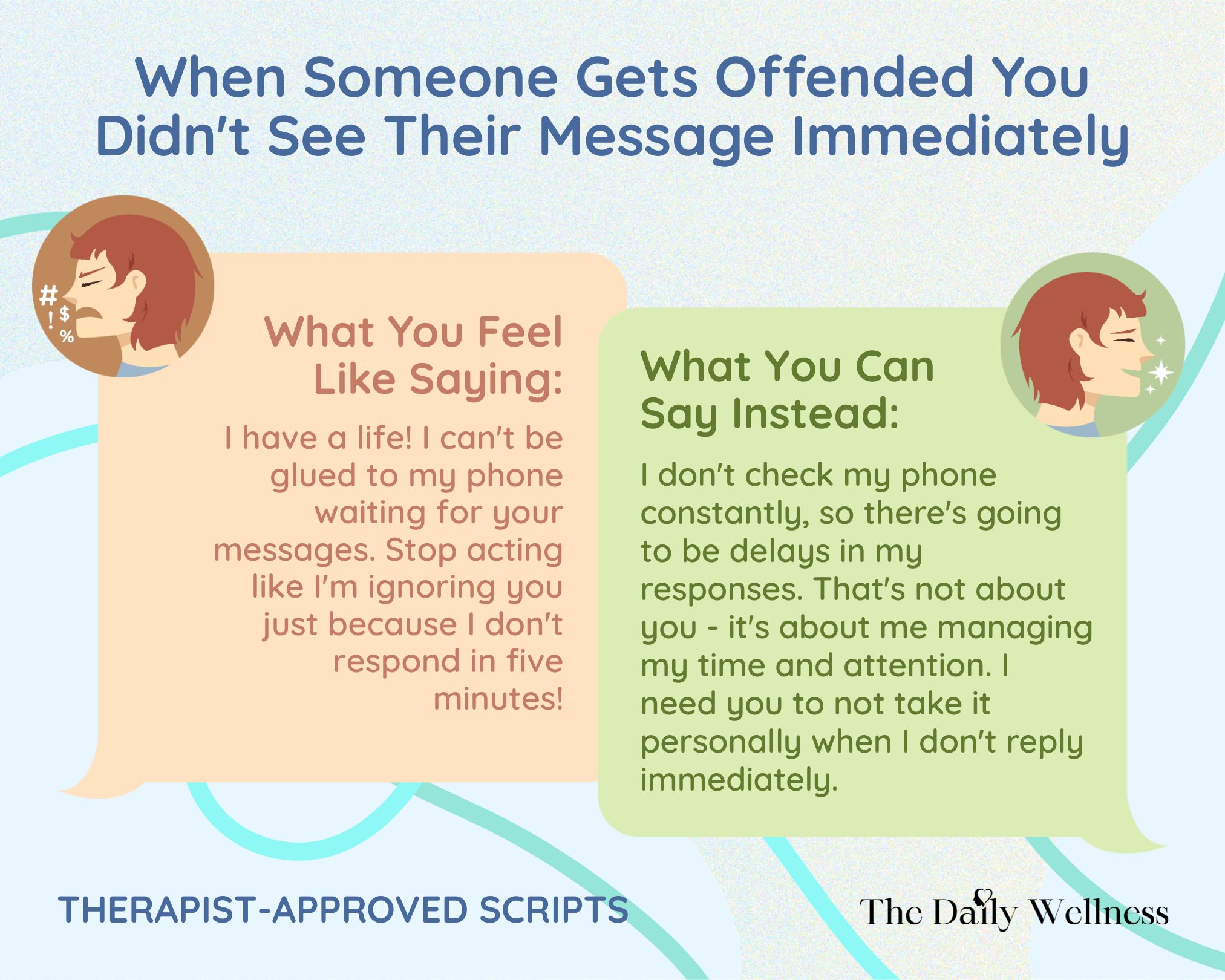 Pro Tip: If they come back with "everyone else responds faster" or "it's not that hard to check your phone," try: "I'm not going to be constantly available just because other people are. I'll respond when I can." Someone else's expectations about instant communication don't get to dictate your relationship with your phone.