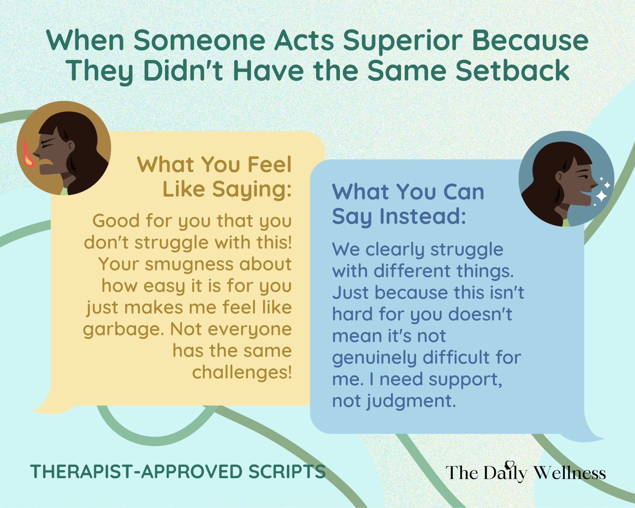 Why It Works: You're acknowledging that people have different challenges, pushing back on the implied superiority, and saying clearly what you actually need.