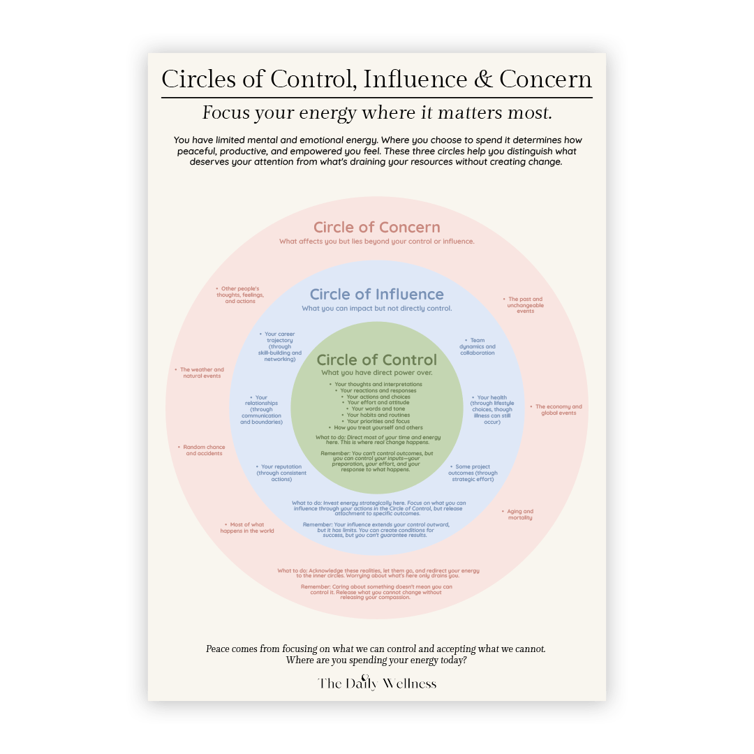 When everything feels overwhelming, it helps to know where your power actually lies. These Circles of Control, Influence & Concern offer a simple way to help you recognize what you can directly change, what you might be able to influence, and what deserves your acceptance rather than your worry. Download these Circles of Control, Influence & Concern now and find clarity about where to invest your energy