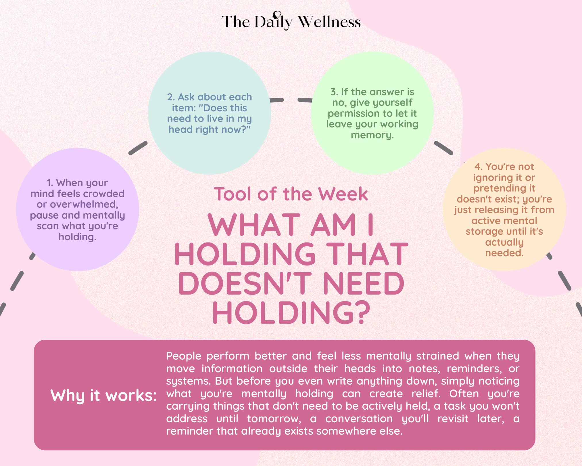What it is: A mental decluttering practice where you pause and ask: "Does this need to live in my head right now?" Your working memory, the mental space where you temporarily hold information while thinking and planning, is limited. When too many unfinished thoughts, worries, and to-dos pile up there at once, you feel overloaded even if you're not actually doing anything.