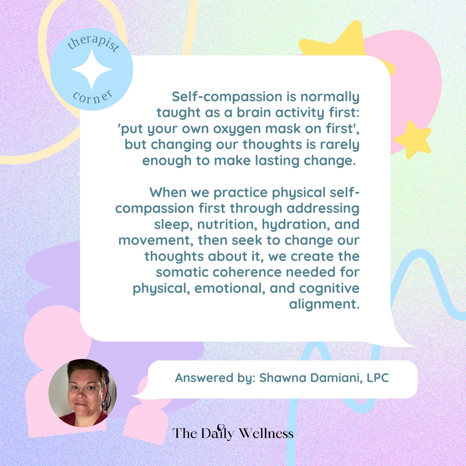 Self-compassion is normally taught as a brain activity first. We are told, "you have to put your own oxygen mask on first, before you can care for others." Many times, therapy seeks to change a person's thoughts about self-compassion and self-care before practicing physical ways to address these.