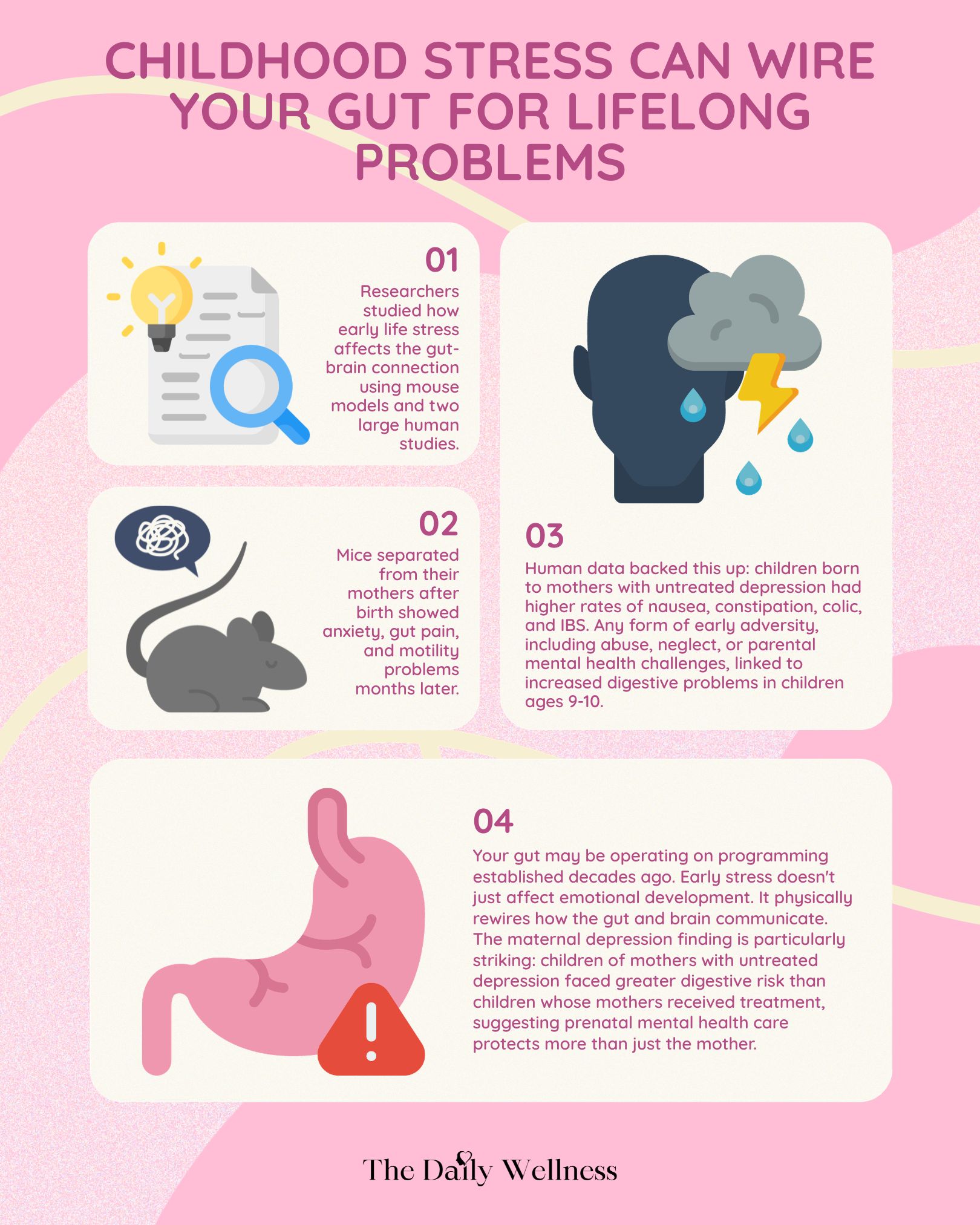 Human data backed this up: children born to mothers with untreated depression had higher rates of nausea, constipation, colic, and IBS. Any form of early adversity, including abuse, neglect, or parental mental health challenges, is linked to increased digestive problems in children ages 9-10.