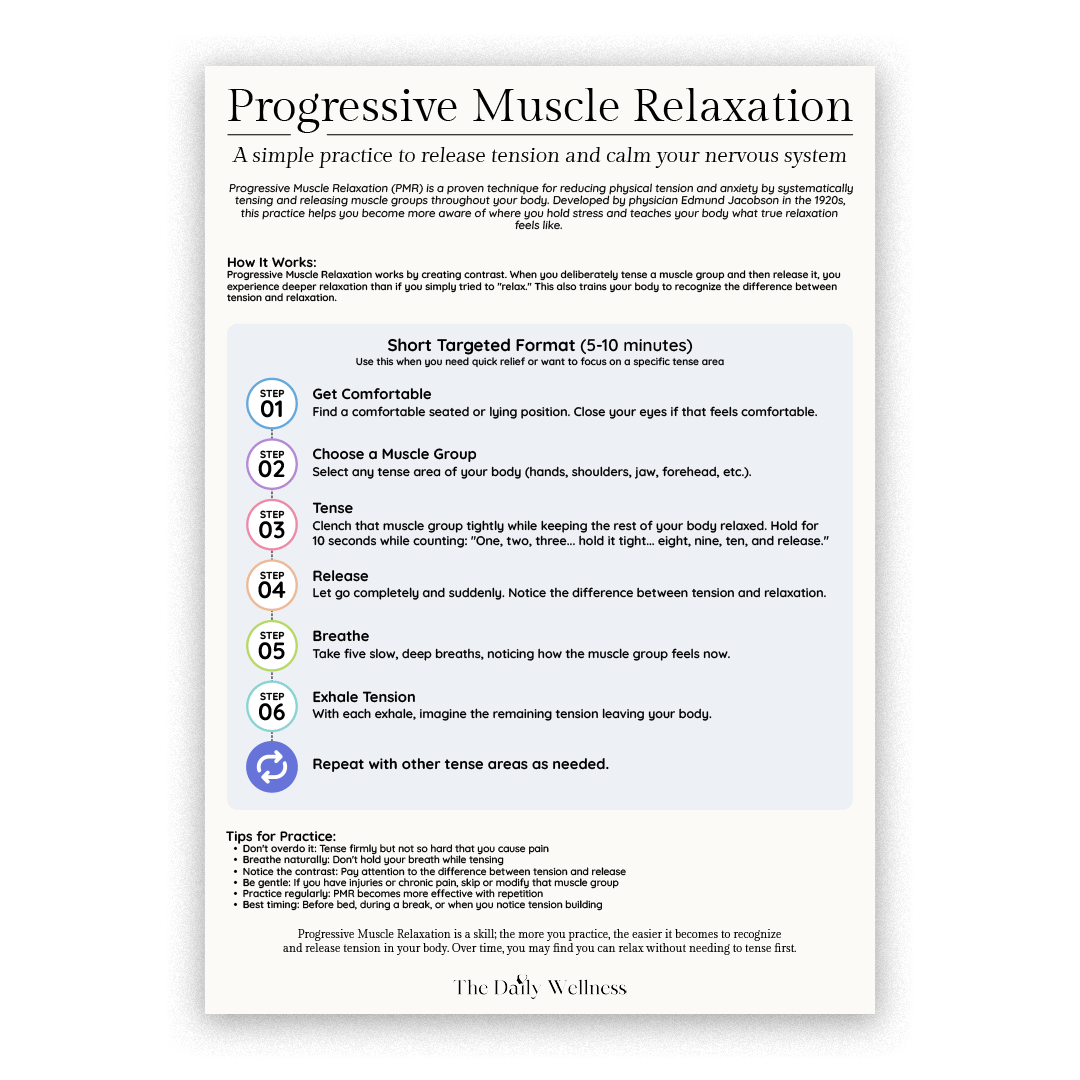 Progressive Muscle Relaxation is a proven technique for releasing physical tension and calming anxiety by systematically tensing and releasing muscle groups throughout your body. This practice teaches your body what true relaxation feels like, and with practice, you'll be able to release tension without needing to tense first.