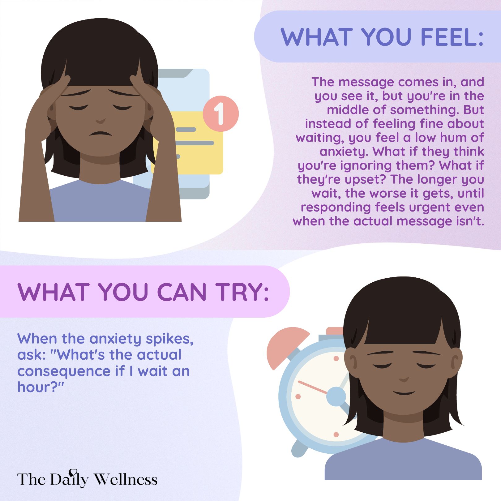But instead of feeling fine about waiting, you feel a low hum of anxiety. What if they think you're ignoring them? What if they're upset? The longer you wait, the worse it gets, until responding feels urgent even when the actual message isn't.