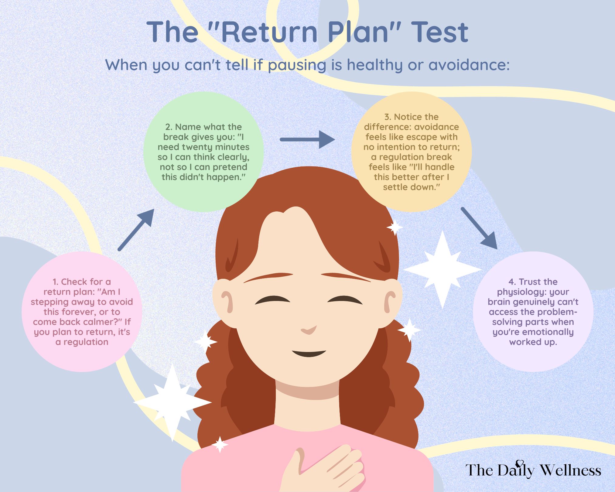 Notice the difference: avoidance feels like escape with no intention to return; a regulation break feels like "I'll handle this better after I settle down."